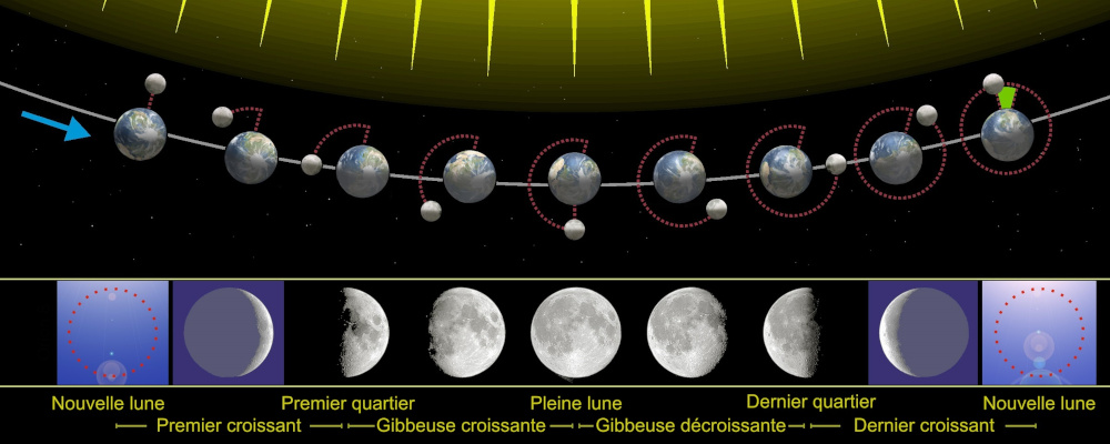 La phase de la nouvelle lune marque le début du cycle lunaire. À ce moment-là, la face illuminée de la lune est tournée loin de la Terre, et elle semble pratiquement invisible depuis notre perspective. La lune se situe entre la Terre et le Soleil, avec la face éclairée éloignée de nous.